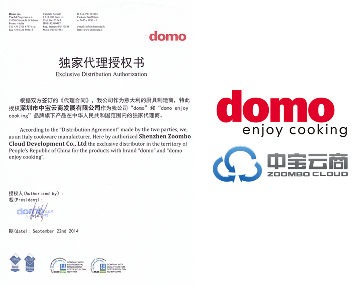 2014年9月,DOMO正式携手深圳市中宝云商发展有限公司(简称“中宝云商”),授权深圳市中宝云商发展有限公司为中国区独家代理商,开始迈步进军中国高端厨具市场。