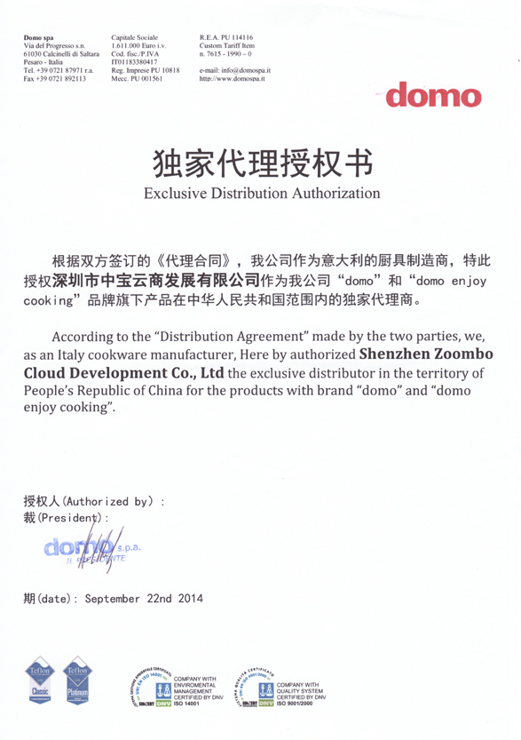 2014年9月,广东中宝炊具制品有限公司全资子公司——深圳市中宝云商发展有限公司,正式成为意大利知名厨具品牌“domo”、“domo enjoy cooking”的中国独家代理商。